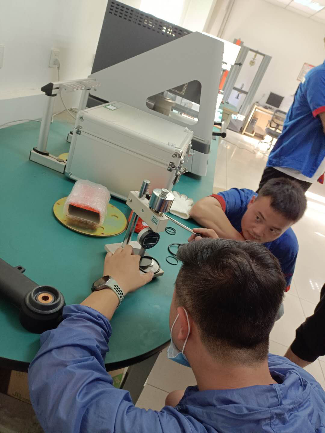 隨后,美泰工程師為客戶講解了邵氏硬度計(jì)的操作和功能。美泰MLX-A型數(shù)顯邵氏硬度計(jì),構(gòu)造簡單、小巧便攜、讀數(shù)直觀、使用方便,既可手持測量,亦可置于 配套的定荷架上定荷測定,被廣泛應(yīng)用于橡膠、塑料的硬度測定。通過調(diào)節(jié)載臺的高低來對應(yīng)不同的工件,手動調(diào)節(jié)壓頭使其接觸到被測件表面來得出測值。