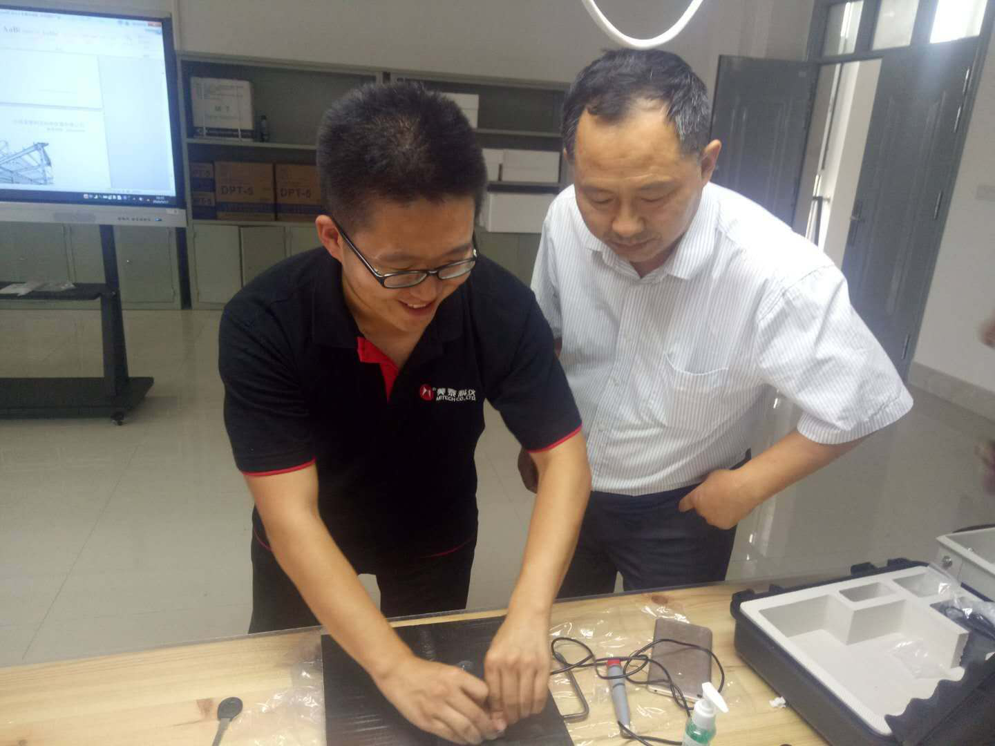 2020年9月16日至17日,美泰科儀派出技術工程師上門為日照地區某學院提供超聲波探傷儀現場交貨培訓,并給予專業學科的教師講解我司為該專業定制的教學課件及動畫演示視頻,共同探討超聲探傷教學內容大綱。