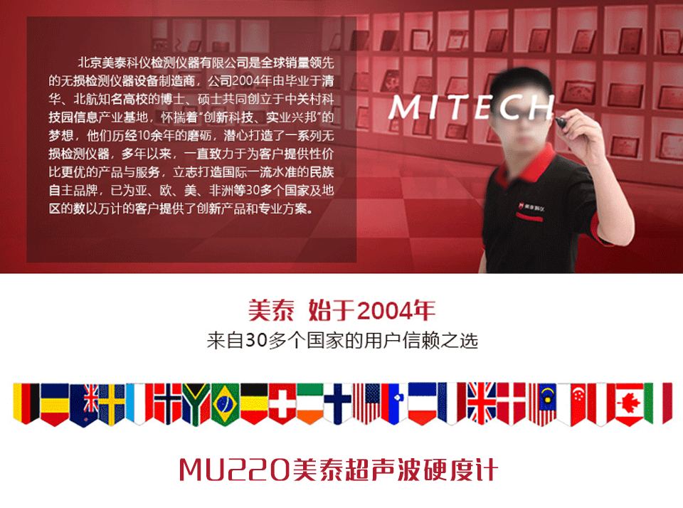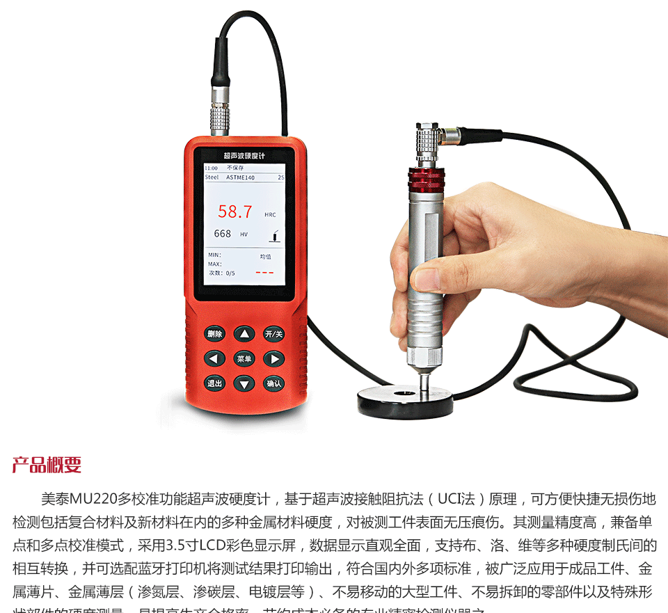 產品概述 美泰MU220多校準功能超聲波硬度計,基于超聲波接觸阻抗法(UCI法)原理,可方便快捷無損傷地檢測包括復合材料及新材料在內的多種金屬材料硬度,對被測工件表面無壓痕傷。其測量精度高,兼備單點和多點校準模式,采用3.5寸LCD彩色顯示屏,數據顯示直觀全面,支持布、洛、維等多種硬度制氏間的相互轉換,并可選配藍牙打印機將測試結果打印輸出,符合國內外多項標準,被廣泛應用于成品工件、金屬薄片、金屬薄層(滲氮層、滲碳層、電鍍層等)、不易移動的大型工件、不易拆卸的零部件以及特殊形狀部件的硬度測量,是提高生產合格率、節約成本必備的專業精密檢測儀器之一。