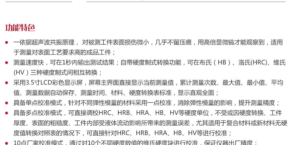 儀器特點依據超聲波共振原理,對被測工件表面無壓痕損傷,適用于測量對表面工藝要求高的成品工件;