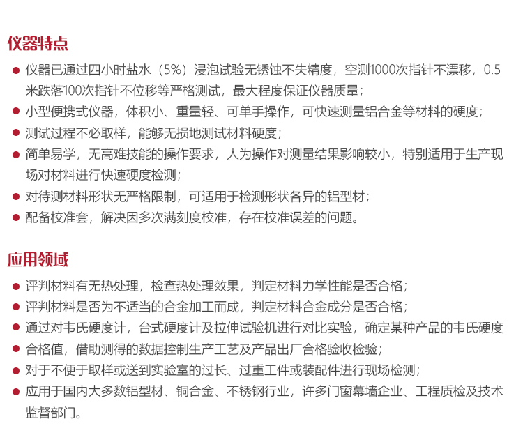 產(chǎn)品概述MW-20系列鋁合金系列韋氏硬度計又稱鉗式硬度計,基于機械壓入測量原理,可方便快捷地現(xiàn)場檢測鋁合金材料的硬度。它們體積小、重量輕、單手可操作,檢測過程中不必取樣,無高難技能的操作要求。該系列產(chǎn)品設(shè)有多種型號,可滿足多數(shù)生產(chǎn)質(zhì)量控制及合格判定的檢測需求,對成批產(chǎn)品進行逐件檢測。被廣泛的應(yīng)用于鋁型材行業(yè)及諸多門窗幕墻企業(yè)、工程質(zhì)檢及技術(shù)監(jiān)督部門,是提高生產(chǎn)合格率、節(jié)約成本必備的專業(yè)儀器。