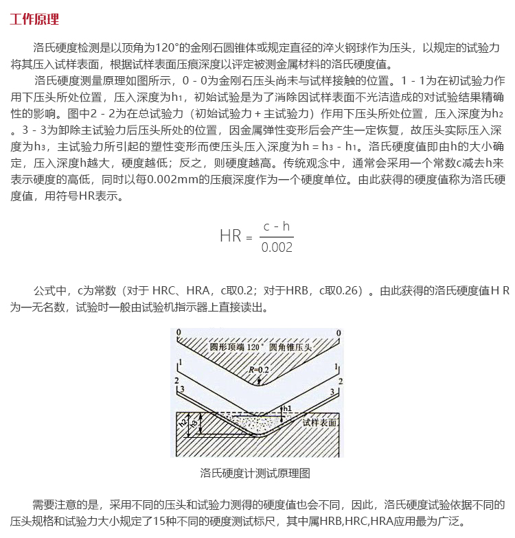公式中,c為常數(對于 HRC、HRA,c取0.2;對于HRB,c取0.26)。由此獲得的洛氏硬度值HR為一無名數,試驗時一般由試驗機指示器上直接讀出。