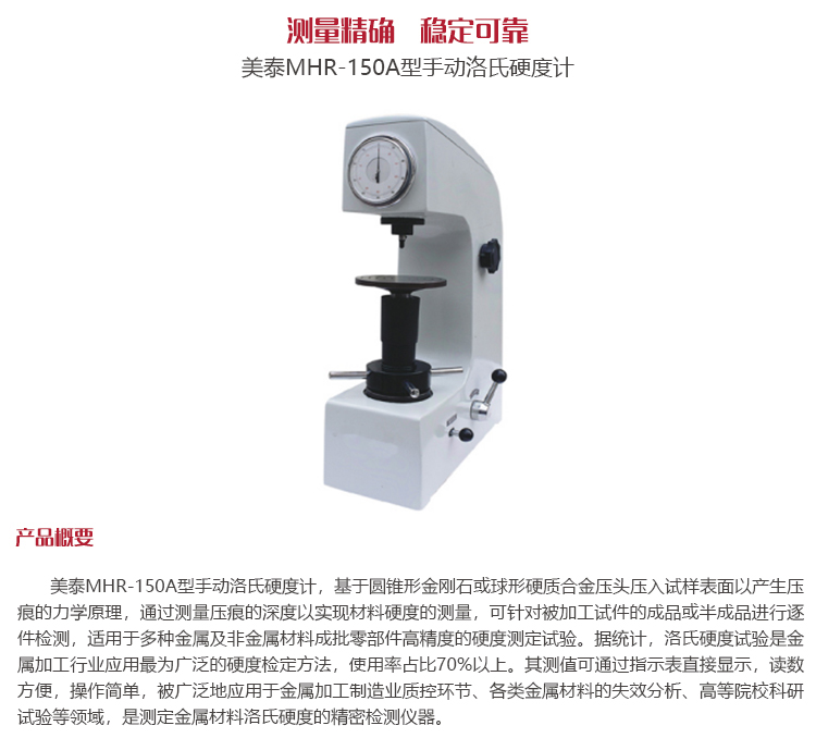 產品概述美泰MHR-150A型手動洛氏硬度計,基于圓錐形金剛石或球形硬質合金壓頭壓入試樣表面以產生壓痕的力學原理,通過測量壓痕的深度以實現材料硬度的測量,可針對被加工試件的成品或半成品進行逐件檢測,適用于多種金屬及非金屬材料成批零部件高精度的硬度測定試驗。據統計,洛氏硬度試驗是金屬加工行業應用最為廣泛的硬度檢定方法,使用率占比70%以上。其測值可通過指示表直接顯示,讀數方便,操作簡單,被廣泛地應用于金屬加工制造業質控環節、各類金屬材料的失效分析、高等院校科研試驗等領域,是測定金屬材料洛氏硬度的精密檢測儀器。