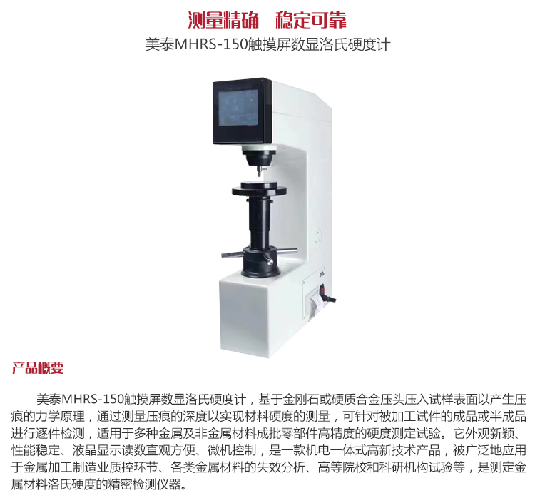 產品概述美泰MHRS-150觸摸屏數顯洛氏硬度計,基于金剛石或硬質合金壓頭壓入試樣表面以產生壓痕的力學原理,通過測量壓痕的深度以實現材料硬度的測量,可針對被加工試件的成品或半成品進行逐件檢測,適用于多種金屬及非金屬材料成批零部件高精度的硬度測定試驗。它外觀新穎、性能穩定、液晶顯示讀數直觀方便、微機控制,是一款機電一體式高新技術產品,被廣泛地應用于金屬加工制造業質控環節、各類金屬材料的失效分析、高等院校和科研機構試驗等,是測定金屬材料洛氏硬度的精密檢測儀器。