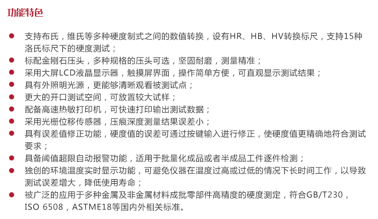 被廣泛的應用于多種金屬及非金屬材料成批零部件高精度的硬度測定,符合GB/T230,ISO 6508,ASTME18等國內外相關標準。