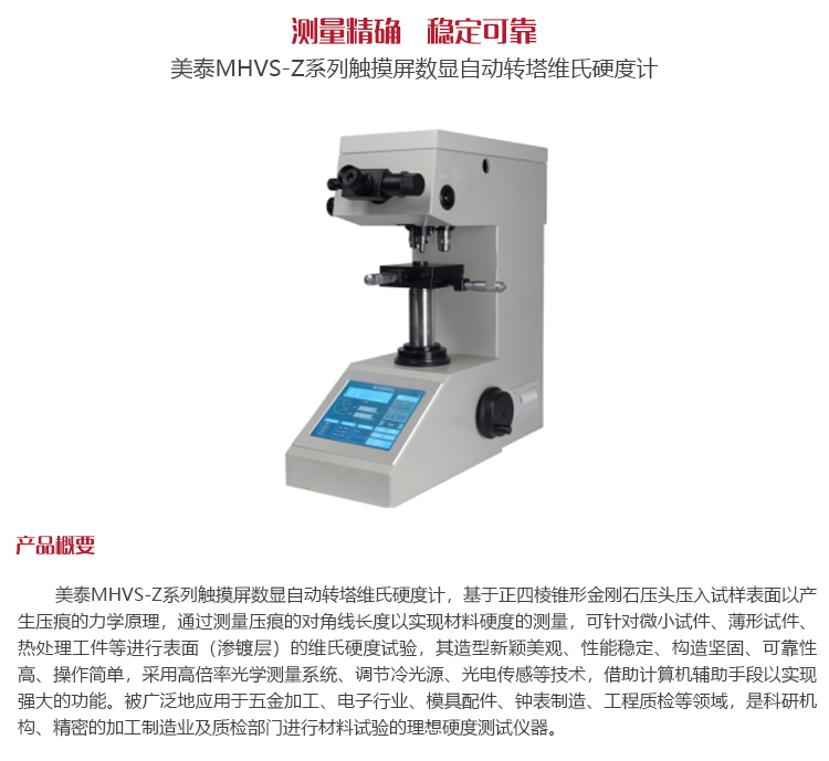 美泰MHVS-Z系列觸摸屏數(shù)顯自動轉(zhuǎn)塔維氏硬度計,基于正四棱錐形金剛石壓頭壓入試樣表面以產(chǎn)生壓痕的力學(xué)原理,通過測量壓痕的對角線長度以實現(xiàn)材料硬度的測量,可針對微小試件、薄形試件、熱處理工件等進行表面(滲鍍層)的維氏硬度試驗,其造型新穎美觀、性能穩(wěn)定、構(gòu)造堅固、可靠性高、操作簡單,采用高倍率光學(xué)測量系統(tǒng)、調(diào)節(jié)冷光源、光電傳感等技術(shù),借助計算機輔助手段以實現(xiàn)強大的功能。被廣泛地應(yīng)用于五金加工、電子行業(yè)、模具配件、鐘表制造、工程質(zhì)檢等領(lǐng)域,是科研機構(gòu)、精密的加工制造業(yè)及質(zhì)檢部門進行材料試驗的理想硬度測試儀器。
