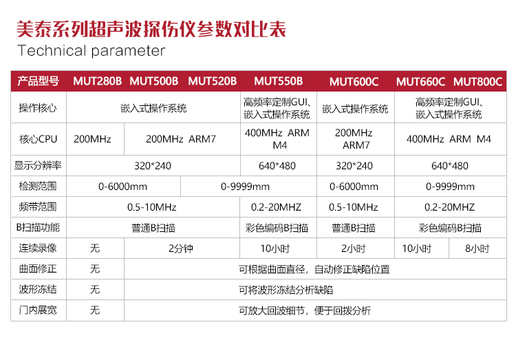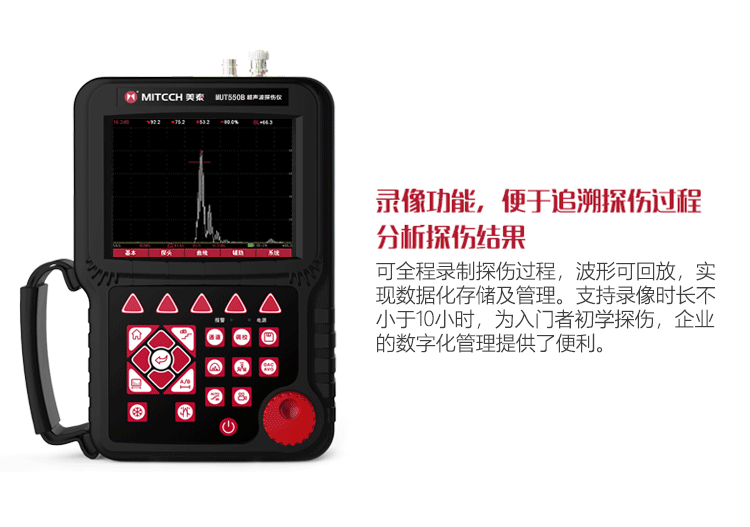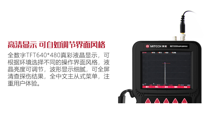 產品概述MUT550B數字式超聲波探傷儀依據超聲傳播原理,可精準、靈敏地進行工件內部多種缺陷(裂紋、夾雜、氣孔等)的檢測、定位、評估和診斷。采用全數字TFT640×480真彩色液晶顯示屏,在光線昏暗及日光強烈環境下都能為您呈現清晰缺陷;0-9999mm大量程可滿足制造業、鋼鐵冶金業、金屬加工業、化工業等常規的缺陷檢測需求;低功耗設計配備大容量高性能鋰離子電池模塊可連續工作10小時以上;全中文主從式菜單,注重用戶體驗,集快捷按鍵、數碼飛梭旋輪、十字菜單三種操作方式于一體,不同使用習慣均可操作自如;設有綜合性能指標自檢功能,可自動生成測試報告,支持多語言。該產品具有很高的性價比,是實用經濟款超聲檢測儀器的明智之選。