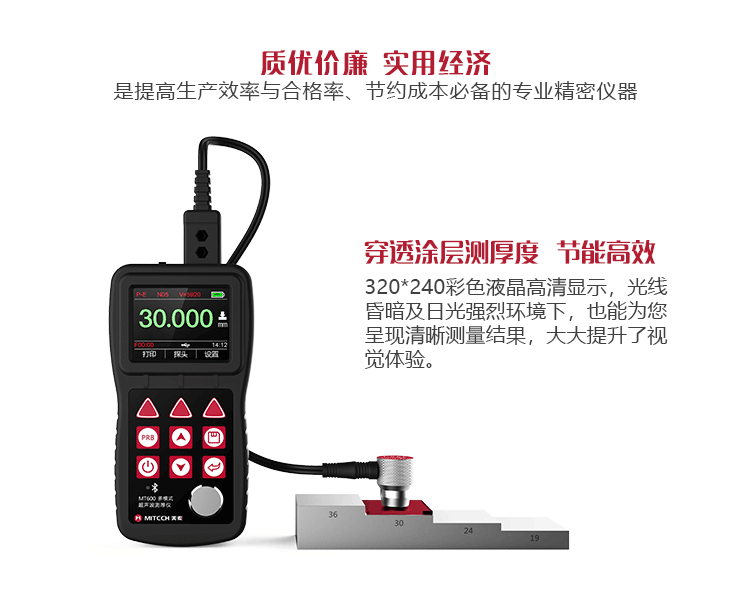 產品概述MT600超聲波測厚儀是美泰公司強力推出的升級產品,它更加注重用戶體驗及功能創新,采用320×240彩色液晶顯示屏,光線昏暗及日光強烈環境下也能為您呈現清晰測量結果,大大提升了視覺體驗,IP65防護等級,可有效防御惡劣現場環境中的油污、粉塵及其它腐蝕;創新設計的語言播報測量結果功能,可方便讀數,超出設定范圍可自動報警,滿足高效采集材料多點厚度的精準檢測需求,支持0.001高精度顯示、藍牙通訊,兼備穿透涂層模式與普通模式雙效功能,其獨特的可穿透涂層測厚度的性能為表面涂有油漆或防腐材料的工件厚度檢測提供了更加高效的解決方案,測量前無需處理掉表面的涂層,可直接測量。被廣泛應用于石油、化工、冶金、造船、航空、航天等領域的生產設備中各種管道及壓力容器腐蝕減薄程度的監測,也可用于對各種板材及各種加工零件做精確的測量。是提高生產效率與合格率、節約成本必備的專業精密儀器。