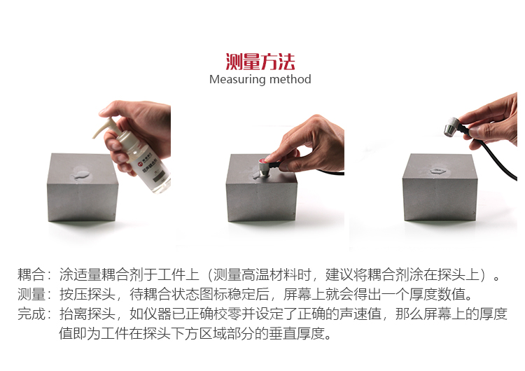 為了使探頭正常工作,必須將探頭表面與待測工件表面之間的空氣去掉,這需要使用耦合劑來完成。這種液體之所以稱為耦合劑是因為從探頭中發射的超聲波經過該液體進入待測工件,其回波又要經該液體返回探頭。在測量前,應將少量的耦合劑涂在待測工件表面。通常情況,一滴就足夠了。