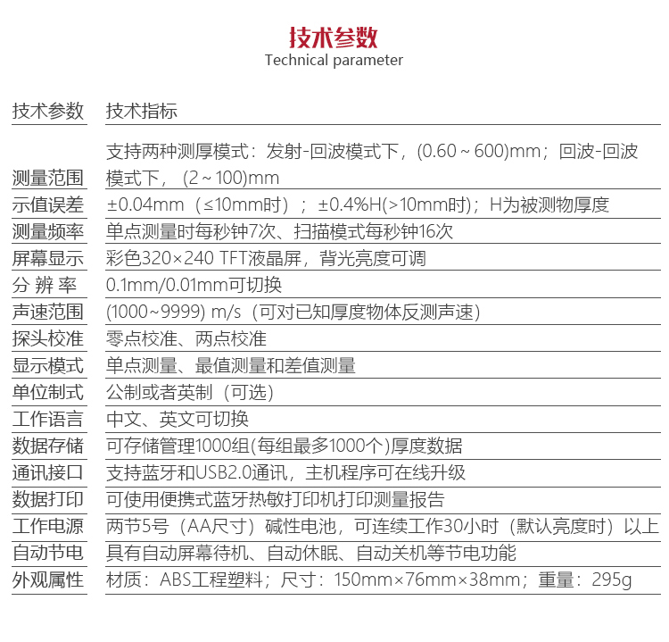 可存儲管理100組(每組最多100個)厚度數據,支持藍牙和USB2.0通訊,主機程序可在線升級