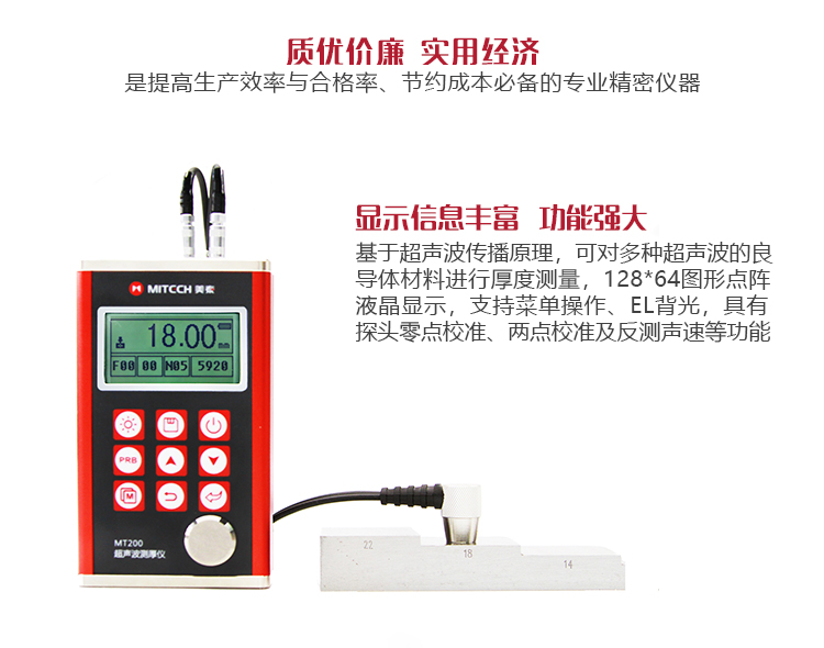 MT200超聲波測厚儀,基于超聲傳播原理,可對金屬、塑料、陶瓷、玻璃及其他多種超聲波的良導體材料進行厚度測量,也可實現對材料聲速的反測。密封的金屬外殼精巧設計,可防御惡劣現場環境中的油污、粉塵;與傳統的測量方法相比,超聲波測厚儀的優勢在于它只要接觸到被測工件的一面即可完成測量,其獨特的無損檢測性能為封閉類管材、容器等厚度檢測受局限的工況提供了完美的解決方案,被廣泛應用于石油、化工、冶金、造船、航空、航天等領域的生產設備中各種管道及壓力容器腐蝕減薄程度的監測,也可用于對各種板材及各種加工零件做精確的測量。