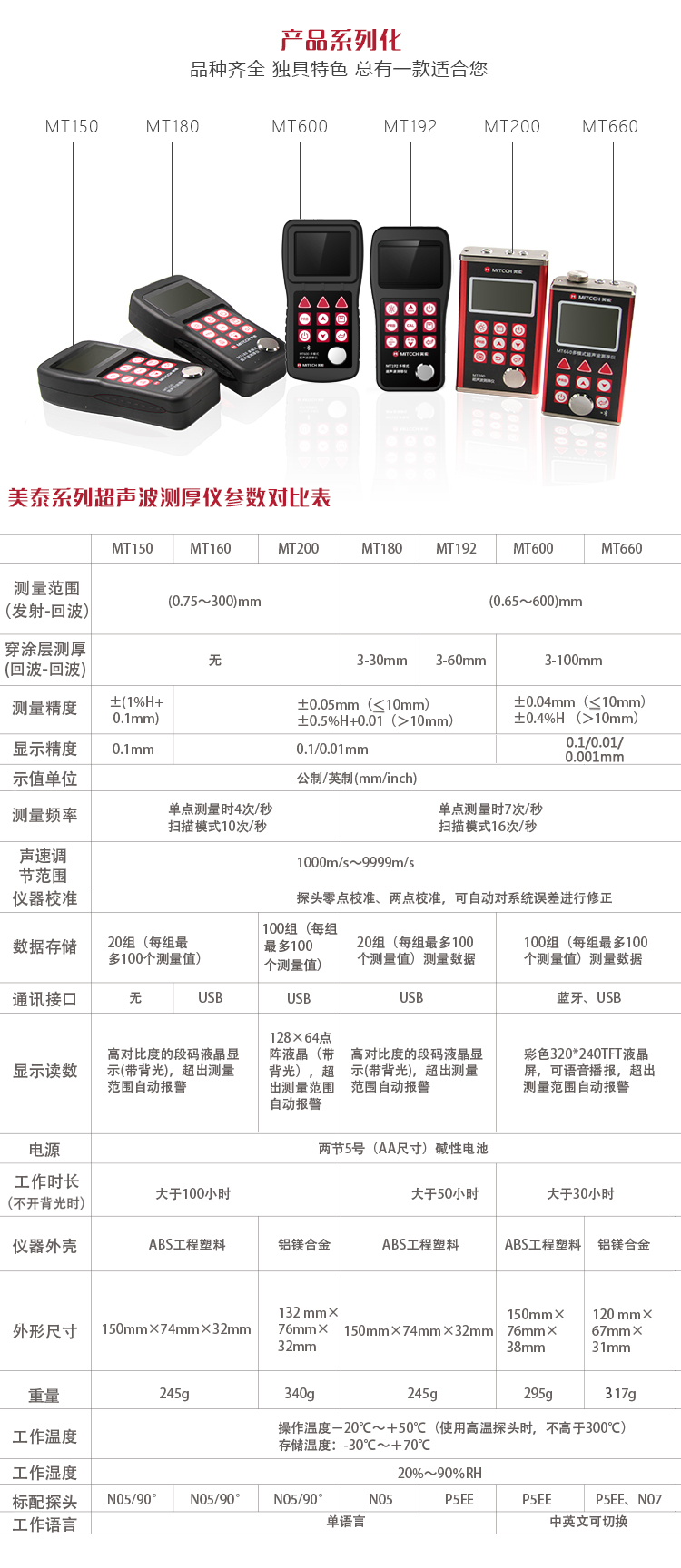 | 美泰系列超聲波測厚儀,均采用低功耗設計理念,超長待機,MT150/MT160/MT200/MT180/MT192/MT280/MT600/MT660均由兩節AA五號電池供電、更換方便。 | |