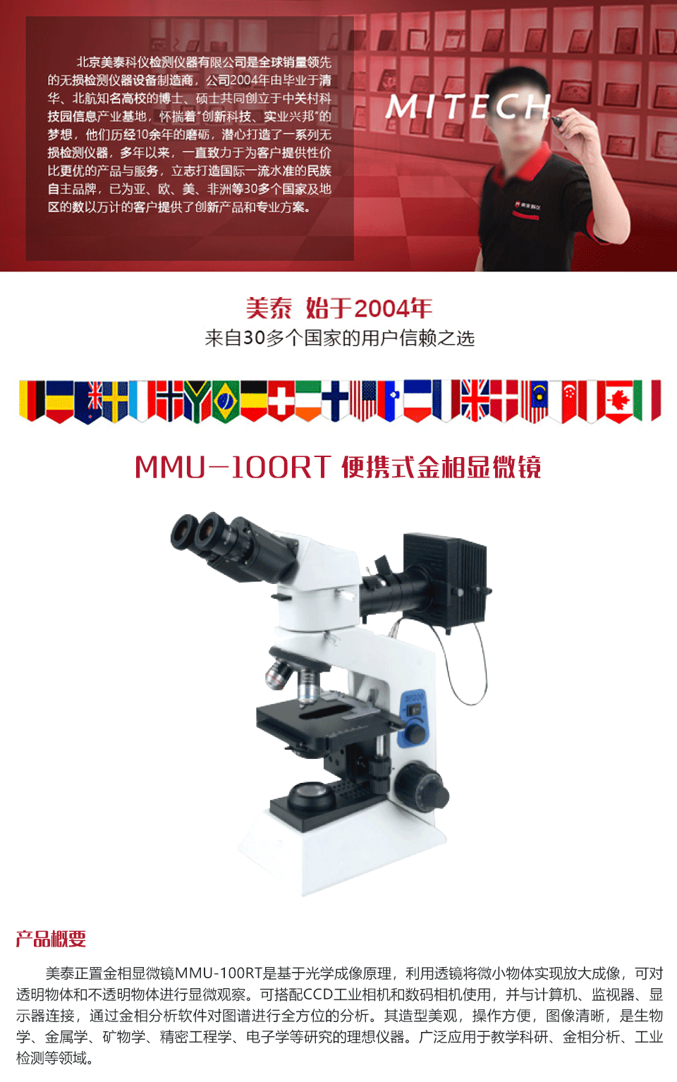 產品概述美泰正置金相顯微鏡MMU-100RT是基于光學成像原理,利用透鏡將微小物體實現放大成像,可對透明物體和不透明物體進行顯微觀察。可搭配CCD工業相機和數碼相機使用,并與計算機、監視器、顯示器連接,通過金相分析軟件對圖譜進行全方位的分析。其造型美觀,操作方便,圖像清晰,是生物學、金屬學、礦物學、精密工程學、電子學等研究的理想儀器。廣泛應用于教學科研、金相分析、工業檢測等領域。