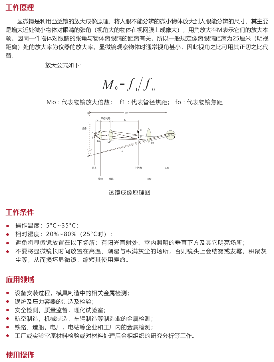 工作原理顯微鏡是利用凸透鏡的放大成像原理,將人眼不能分辨的微小物體放大到人眼能分辨的尺寸,其主要是增大近處微小物體對眼睛的張角(視角大的物體在視網膜上成像大),用角放大率M表示它們的放大本領。因同一件物體對眼睛的張角與物體離眼睛的距離有關,所以一般規定像離眼睛距離為25厘米(明視距離)處的放大率為儀器的放大率。顯微鏡觀察物體時通常視角甚小,因此視角之比可用其正切之比代替。