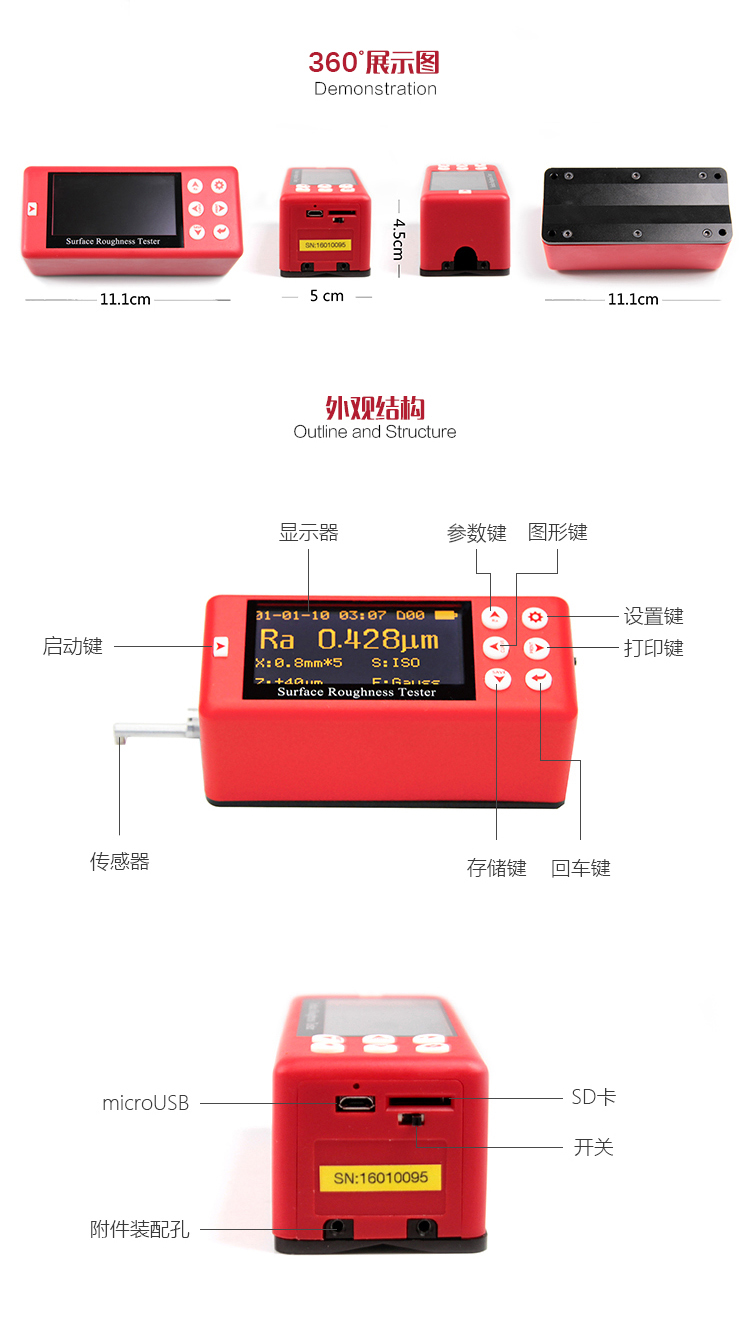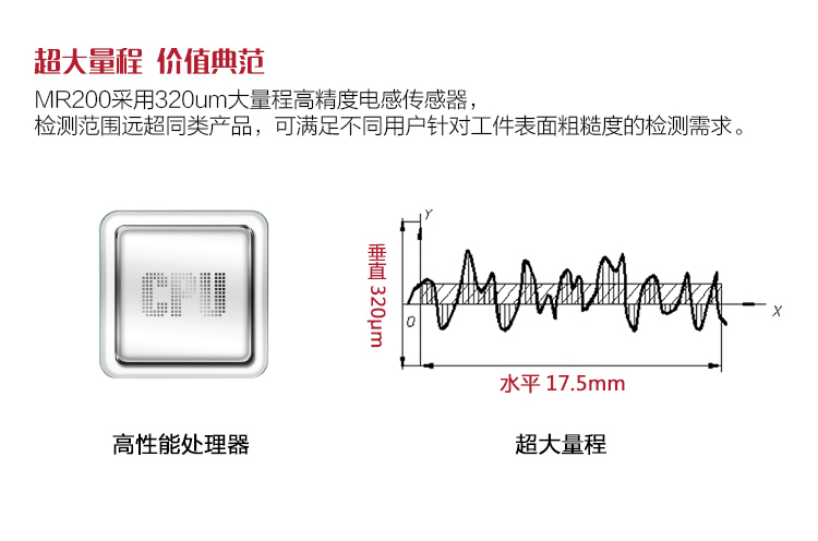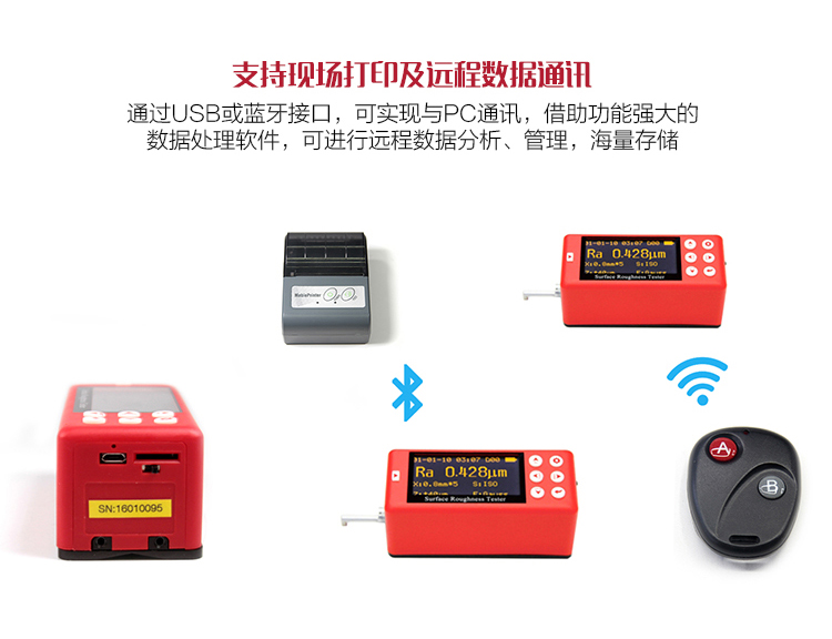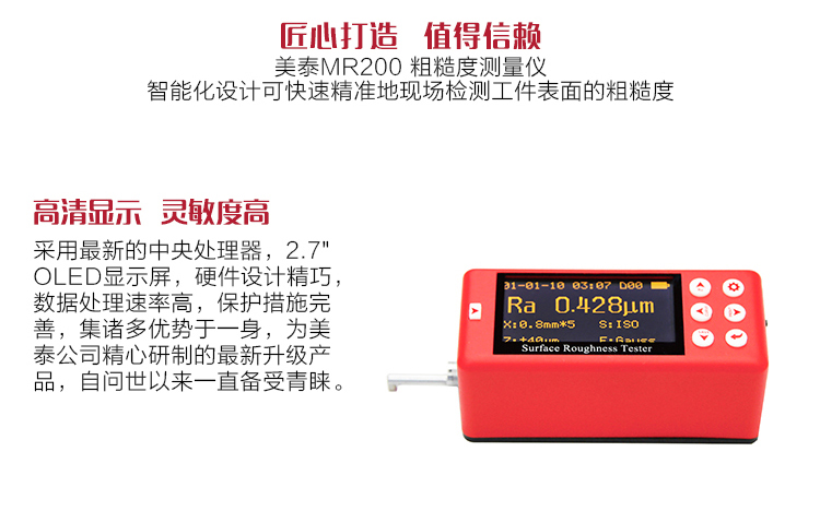 產品概述MR200便攜式粗糙度儀是美泰公司精心研制的最新升級產品,該產品采用當前最新的處理器、2.7寸OLED顯示屏,顯著提升了用戶精準粗糙度測試的體驗,硬件設計精巧、數據處理速率高、保護措施完善,集諸多優勢于一身,自問世以來一直倍受用戶親睞,它超大量程設計,檢測范圍遠超同類產品,可滿足各類用戶的需求,通過MICRO-USB接口或標準藍牙模塊及SD存儲卡,可實現無線遙控啟動、測量;支持現場藍牙打印機無線通訊,通過PC海量存儲數據。被廣泛地應用于各種精密金屬加工制造工藝環節的質量控制,是提高生產合格率、節約成本必備的專業精密儀器。