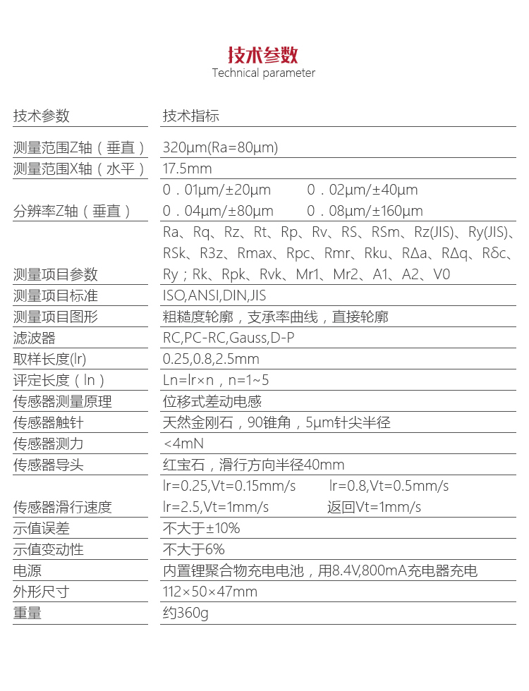 | 傳感器 | 測量原理:位移式差動電感.觸針:天然金剛石,90錐角,5μm針尖半徑.測力:<4mN.導頭:紅寶石,滑行方向半徑40mm. |