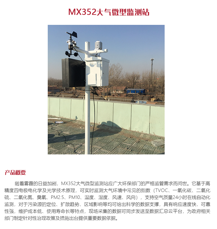 產品概述隨著霧霾的日益加劇,MX352大氣微型監測站應廣大環保部門的嚴格監管需求而問世。它基于高精度四電極電化學及光學技術原理,可實時監測大氣環境中常見的指數(TVOC、一氧化碳、二氧化硫、二氧化氮、臭氧、PM2.5、PM10、溫度、濕度、風速、風向),支持空氣質量24小時在線自動化監測,對于污染源的定位、擴散趨勢、區域影響等均可給出科學的數據支撐,具有響應速度快、可靠性強,維護成本低、使用壽命長等特點,現場采集的數據可同步發送至數據匯總云平臺,為政府相關部門制定針對性治理政策及措施出臺提供重要數據依據。