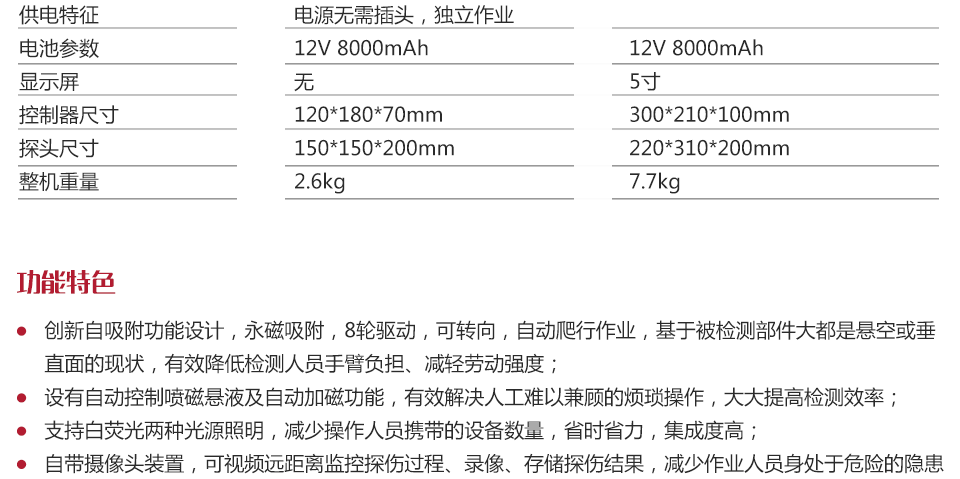 儀器特點(diǎn)? 創(chuàng)新自吸附功能設(shè)計(jì),永磁吸附,8輪驅(qū)動(dòng),可轉(zhuǎn)向,自動(dòng)爬行作業(yè),基于被檢測(cè)部件大都是懸空或垂直面的現(xiàn)狀,有效降低檢測(cè)人員手臂負(fù)擔(dān)、減輕勞動(dòng)強(qiáng)度;