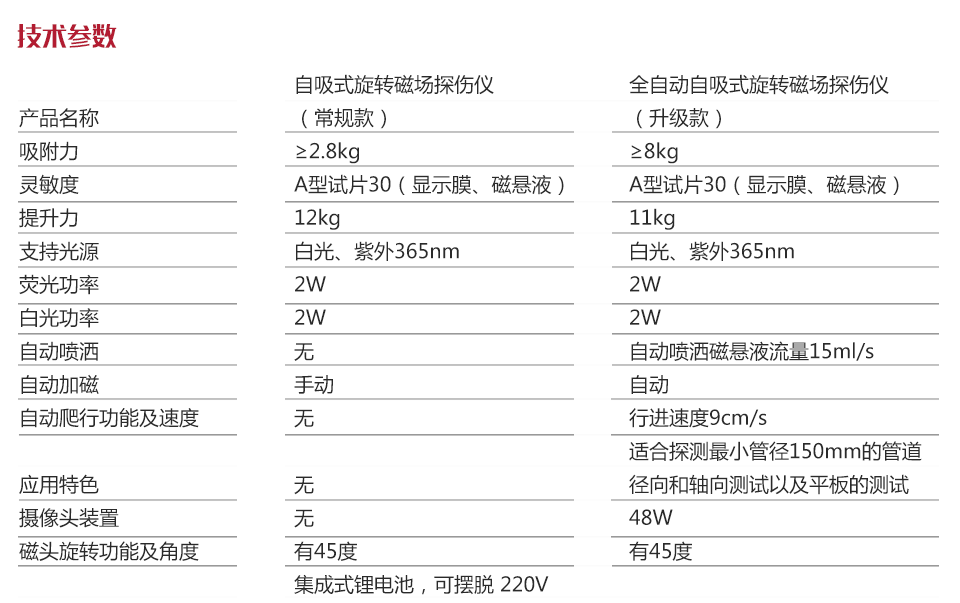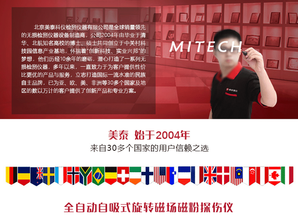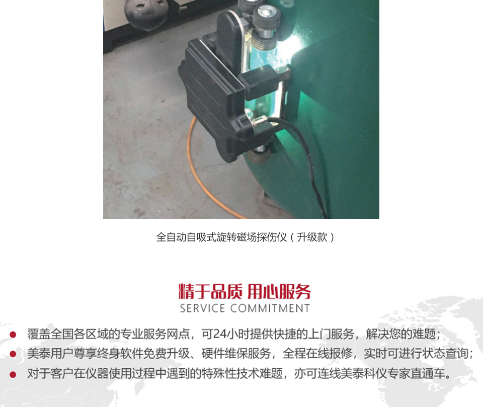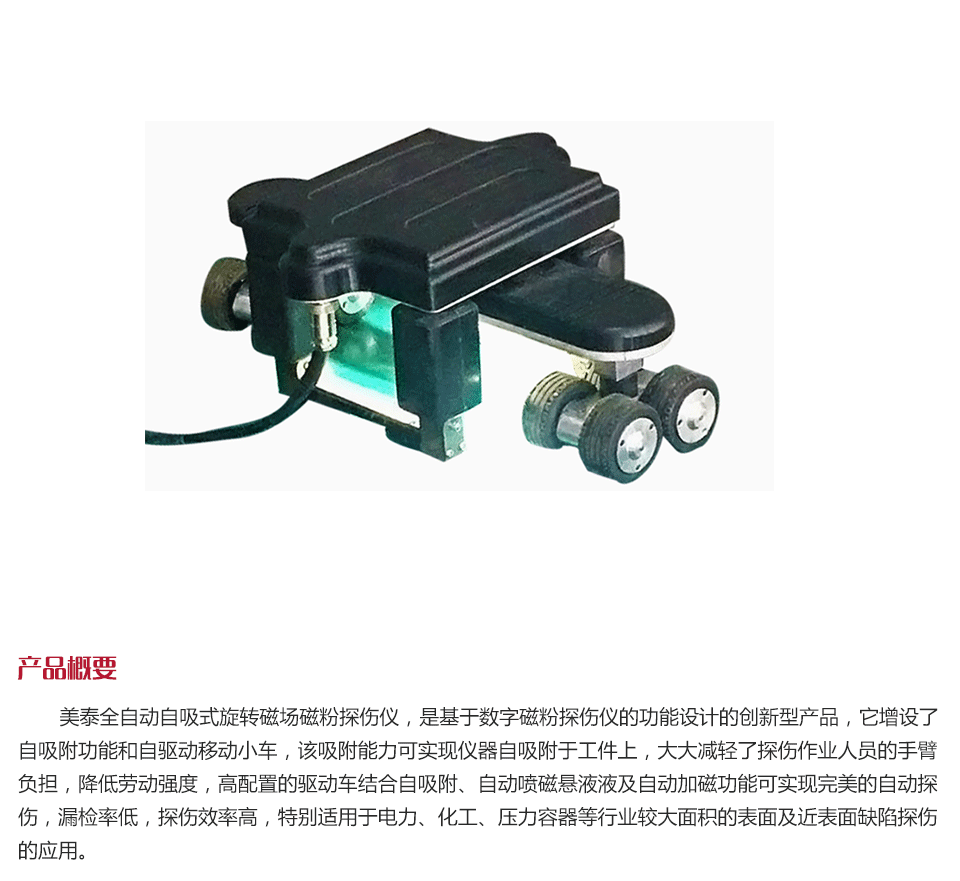 產(chǎn)品概述美泰全自動(dòng)自吸式旋轉(zhuǎn)磁場(chǎng)磁粉探傷儀,是基于數(shù)字磁粉探傷儀的功能設(shè)計(jì)的創(chuàng)新型產(chǎn)品,它增設(shè)了自吸附功能和自驅(qū)動(dòng)移動(dòng)小車,該吸附能力可實(shí)現(xiàn)儀器自吸附于工件上,大大減輕了探傷作業(yè)人員的手臂負(fù)擔(dān),降低勞動(dòng)強(qiáng)度,高配置的驅(qū)動(dòng)車結(jié)合自吸附、自動(dòng)噴磁懸液液及自動(dòng)加磁功能可實(shí)現(xiàn)完美的自動(dòng)探傷,漏檢率低,探傷效率高,特別適用于電力、化工、壓力容器等行業(yè)較大面積的表面及近表面缺陷探傷的應(yīng)用。