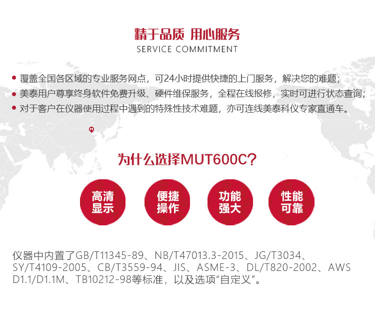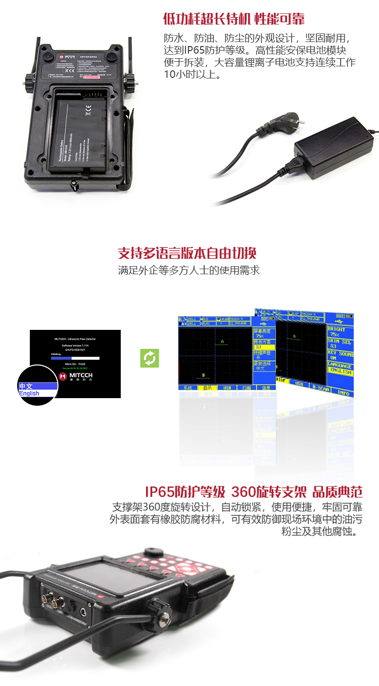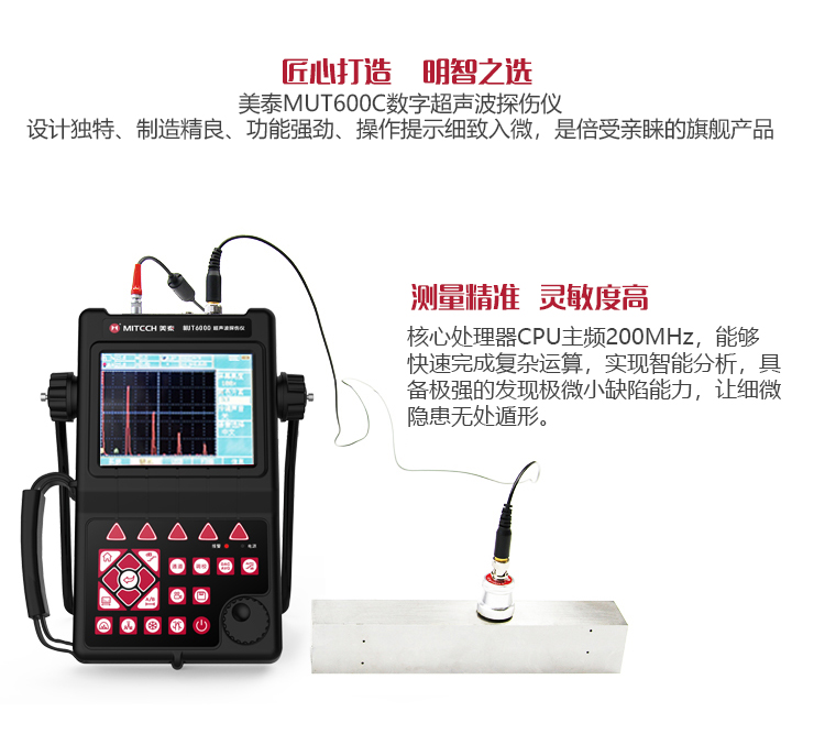 產(chǎn)品概述MUT600C數(shù)字式超聲波探傷儀基于超聲傳播原理,可精準(zhǔn)、靈敏地進(jìn)行工件內(nèi)部多種缺陷(裂紋、夾雜、氣孔等)的檢測、定位、評估和診斷。采用全數(shù)字TFT 320×240真彩色液晶顯示屏,可根據(jù)環(huán)境選擇操作界面風(fēng)格,液晶亮度可調(diào)節(jié),界面設(shè)計(jì)人性化、波形顯示細(xì)膩;可全屏清晰發(fā)現(xiàn)缺陷;單手可把持操作,曲線制作、探頭校準(zhǔn)等操作均可自動(dòng)完成;既可用以用于實(shí)驗(yàn)室,也可以用于工程現(xiàn)場。0-6000mm普通量程可滿足制造業(yè)、鋼鐵冶金業(yè)、金屬加工也、化工業(yè)等常規(guī)的缺陷檢測需求,低功耗設(shè)計(jì)配備大容量高性能鋰離子電池模塊可連續(xù)工作10小時(shí)以上;質(zhì)優(yōu)價(jià)廉,是實(shí)用經(jīng)濟(jì)款超聲檢測儀器的首選。