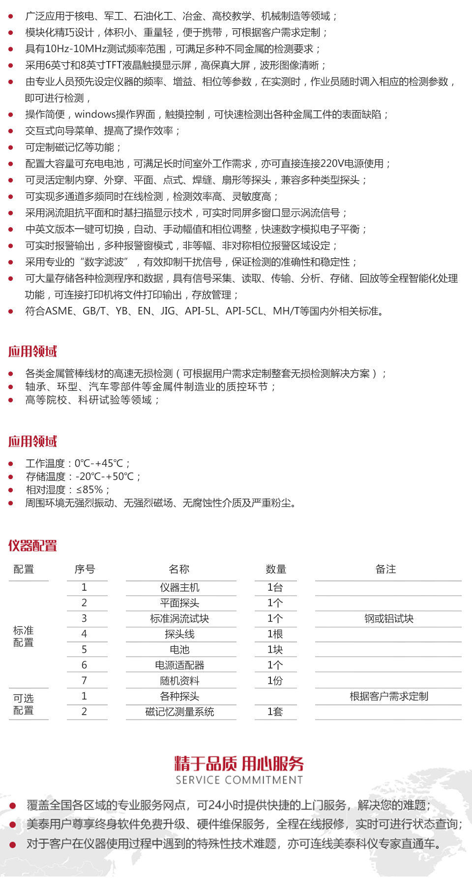 產品概述美泰MET系列便攜式渦流探傷儀,又稱數字電磁檢測儀,它基于電磁感應原理,可高速檢測各種金屬工件表面或近表面的缺陷,其采用最先進的數字電子技術、渦流技術和微處理機技術設計而成,選用6英寸和8英寸TFT液晶觸摸顯示屏,可清晰顯示探測數據,該產品集電腦功能于一體、靈敏度高、性能穩定、可多通道同時檢測、智能化數據分析,可配備智能型探頭,亦可根據客戶需求定制探頭,具備擴展磁記憶、涂層測厚、電導率測量等多種實用功能。被廣泛的應用于各類金屬管棒線、汽車零部件、軸承、石油套管、控油桿、環型金屬零件等的無損檢測以及高等院校科研試驗等領域,是提高生產效率,節約生產成本必備的專業精密檢測儀器。