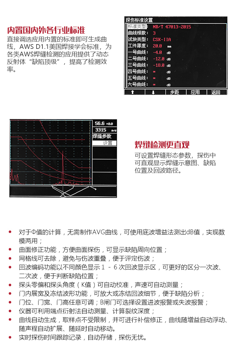 | 探傷標準 | 內置各行業常用探傷標準,直接調用,方便、快捷 |