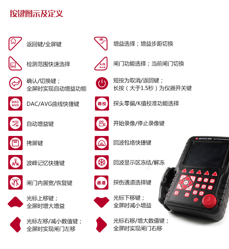 | 自動校準 | 探頭零點和探頭角度(K值)自動校準功能;聲速自動測量功能 |