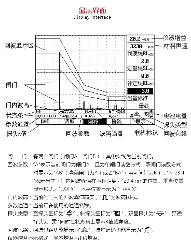 | DAC/AVG | 曲線自動生成,取樣點不受限制,并可進行補償與修正。曲線隨增益自動浮動、隨聲程自動擴展、隨延時自動移動。能顯示任意孔徑的AVG曲線 |